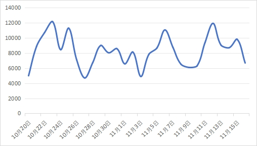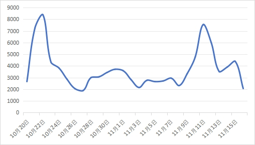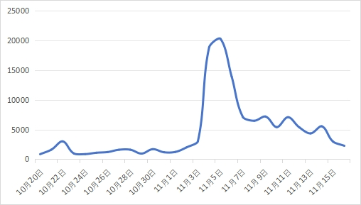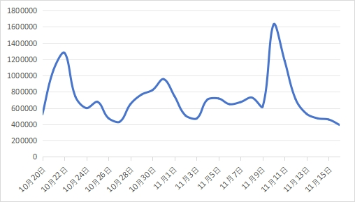 在10月20日至11月16日共计28天监测期内,共收集到“消费维权”相关信息20,176,208条,日均约72万条。10月20日、11月1日、11月11日节点前后时段波动明显,11月10日达到峰值,为1,630,034条。